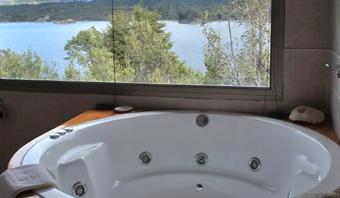 Habitación Volcán ¨Batea Mahuida¨, con vista al lago y cordillera, de 23 m2 con cama King Size, decorada artesanalmente con acolchados mexicanos hechos en telar, TV LED de 32" con decodificador satelital, sillón de tres cuerpos. Baño en suite, de 11 m2 con vista al lago, hidromasaje circular con ozono terapia y ducha separada, mesada de ciprés, lavabo y espejo pintados a mano. Inodoro y Bidet. Placares de lenga.