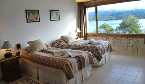 Habitación Volcán ¨Lanín¨, con vista al lago y cordillera, de 23 m2 con dos camas individuales, que pueden preparase como cama matrimonial King Size, decorada artesanalmente con acolchados mexicanos hechos en telar o acolchados mapuches, TV LED de 32" con decodificador satelital, sillón de tres cuerpos. Baño en suite, con vista al lago, hidromasaje individual, mesada de ciprés, lavabo y espejo pintados a mano. Inodoro y Bidet. Placares de lenga.